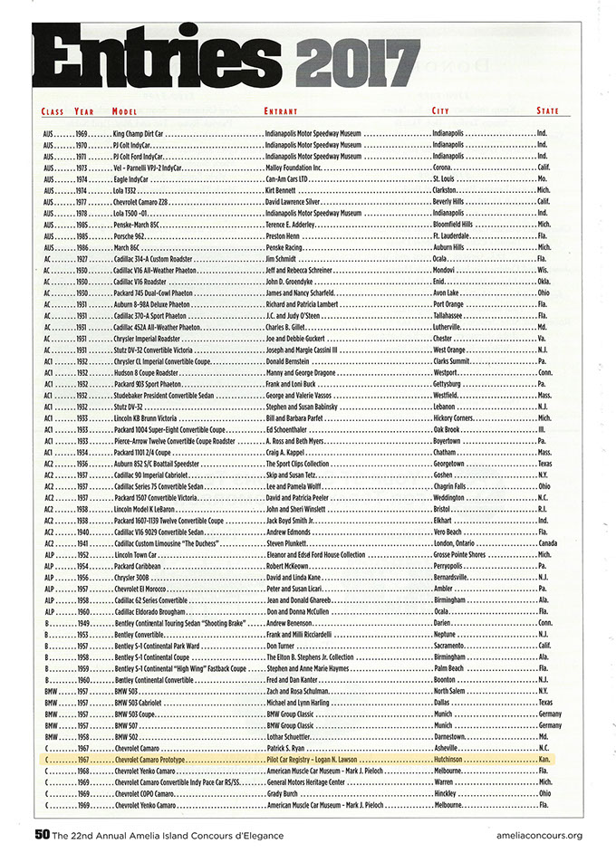 Pilot Car Registry was sponsored by Chevrolet to showcase our research and display at the 22nd Annual Amelia Island Concours d'Elegance. This was by far the most prestigious honor that a Camaro could achieve in the world of car shows. It was held on Sunday, March 12, 2017 at The Golf Club of Amelia Island. In addition to this great honor, Car Fix from Velocity Channel did an interview that aired nationwide in their sixth season as the sixth episode. With the 50th anniversary of the birth of the Camaro being celebrated in 2017......this recognition from Chevrolet and the wonderful men and women of Amelia Island, make this our crowning achievement. Many thanks go out to everyone that donated their time and efforts to make this happen.