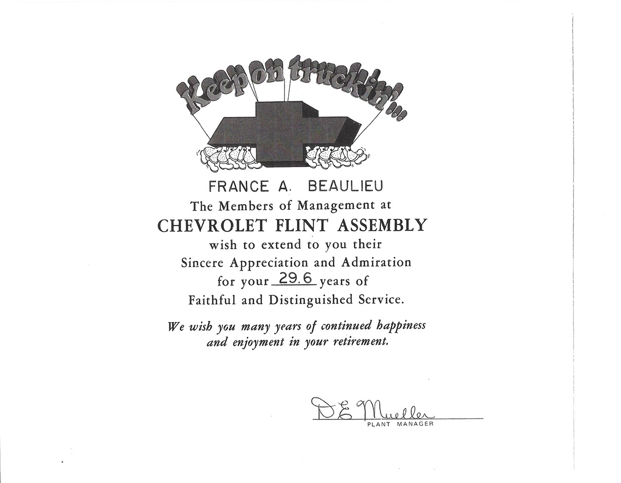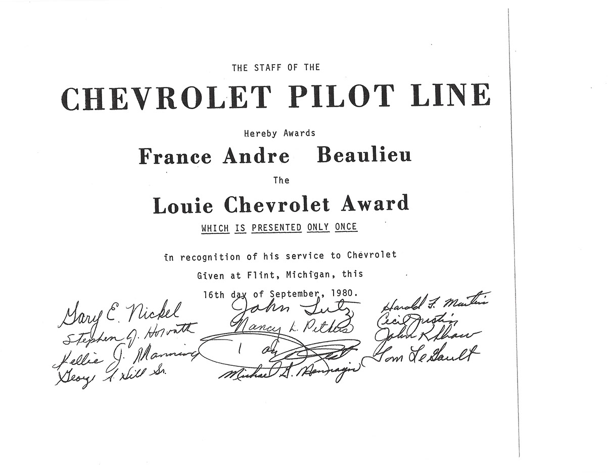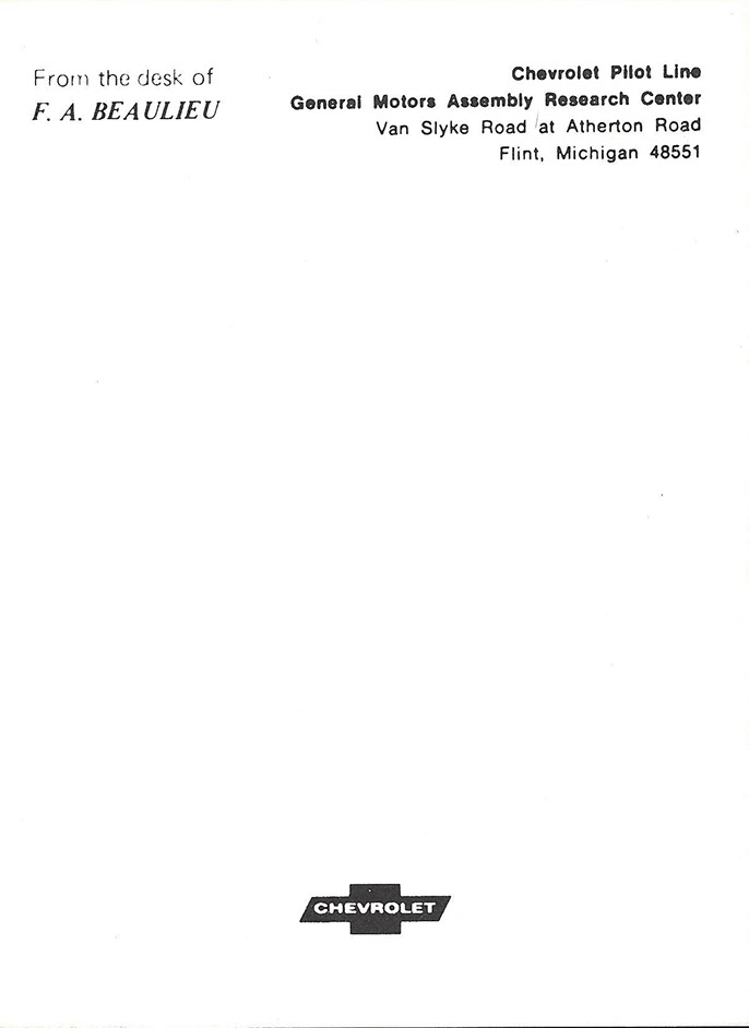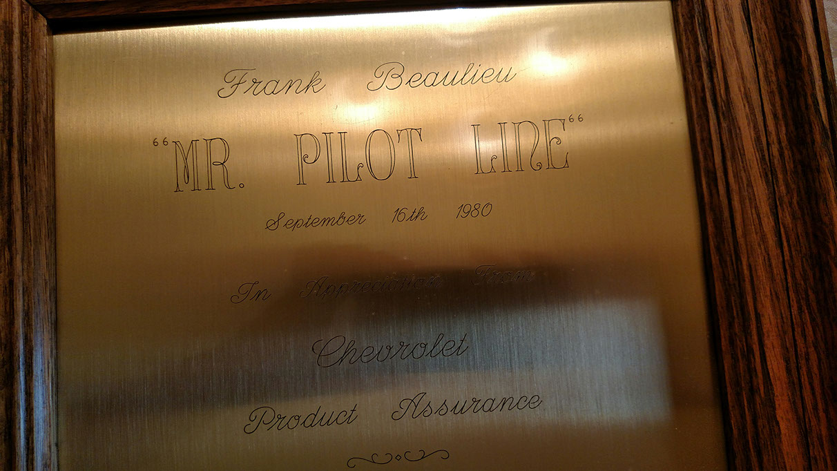 France A. Beaulieu…..lovingly known by friends and family as “Frank”, was born in Lowell, Massachusetts in 1926. At the age of 19, Frank joined the Navy and was ranked the aviation storekeeper third class and earned a World War II Victory Medal. Rebecca, Frank’s daughter, described her dad as a character who had a great sense of humor. She tells about her dad going into a bar while on leave from the Navy and planting a kiss on the first beautiful girl he saw. That was Lois, Rebecca’s mother…..and they married in 1947 and had two children. After the war, Frank’s uncle…who worked in Personnel at General Motors, arranged for Frank to begin on the assembly line. Rising rapidly to the top, Frank began on the Pilot Line in 1948. Frank earned the distinction of “Mr. Pilot Line” by the time the F-car was introduced. His letter and signature graces the introduction page of the Pilot Book. Frank was in charge of the Specifications Division, but wore many hats during the Pilot Prototype Build. He was the decision maker in charge of build configurations, build orders, fleet and special orders, and ultimately…..what divisions received the early prototypes to effectively do their respective jobs. In a nutshell, he was in charge of orchestrating the program before and after the Pilot Prototype’s builds. An extensive photographic history is included. Please note the Pilot Prototype Build Board located on the wall behind his desk. After 30 years of employment, Frank retired in 1979. Unfortunately, in 1983, Frank passed away after a lengthy illness. He was loved by many and played an important role in the development of the car we now know as the “Camaro”. He is buried in Crestwood Memorial cemetery in Grand Blanc, Michigan and survived by his loving daughter….Rebecca Margriff, who was interviewed on May 13, 2015.