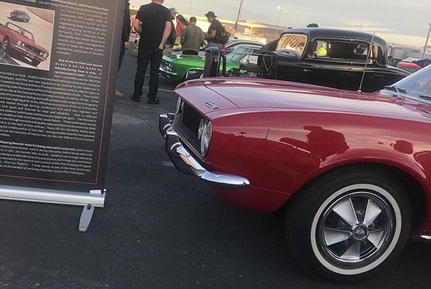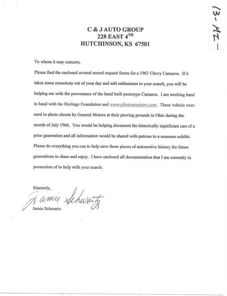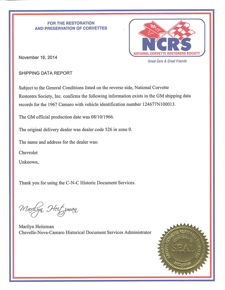 N100013, “The Gear & Axle Test Car”, was delivered on May 31, 1966 from Fisher Body as coach #DD16D. Like all F-Body Pilot Prototypes at Norwood, it started its hand built assembly in consecutive VIN number order as the thirteenth build of the engineering study. One of one on Fleet and Special Order # 5A-26 made by Manufacturing Gear & Axle it carried model # 12667. This red on black convertible was the fifth convertible ever built. With a 327 cubic inch power plant and a power-glide automatic transmission, its presence in photo shoots at General Motors proving grounds make it an important piece of Camaro history. It was required to be received by C. Caswell at the General Motors Proving Grounds on or around June 14, 1966 for testing. NCRS certificates show #13 being returned to corporate, Zone 0, where it was used as a company promotional vehicle until March of 1967. This car is confirmed to exist and was the beneficiary of a NOS restoration in 2017. In person authentication of N100013 was accomplished by Pilot Car Registry on 3-1-2015.