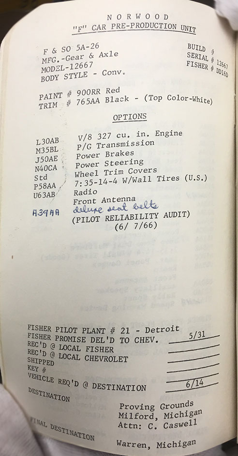 One of one on Fleet and Special Order # 5A-26 made by Manufacturing Gear & Axle, it carried model # 12667. This red on black convertible was the fifth Pilot Prototype convertible ever built. N100013 was hand built utilizing components marked as Handmade, Prototype, and Pilot and was required to be received by the Supervisor in charge, Claire Caswell at the General Motors Proving Grounds by June 14, 1966 for rigorous gear and axle testing under the auspices of Pilot Prototype Reliability Audits.