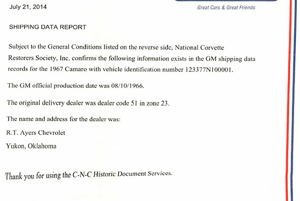 It was during its time in secretive storage that Pete Estes held a dramatic 10:00 a.m. 14 city network news conference and officially released the name “Camaro” to the world. Up until that moment, all Pilot Prototypes had been built without even knowing a name. The Camaro was received by the automotive press to much enthusiasm and was estimated to account for 12% of Chevrolet production in 1967. N100001 was removed from lock and key and used as an assembly test mule before being required at destination by GM employee D. Reeves at 6030 Cass Avenue in Detroit on August 1, 1966 officially prior to the unveiling of the Camaro on or around August 25, 1966 at the Sheraton-Cadillac Hotel. It was at this convention that R.T. Ayers first saw the sport coupe and used his influence inside the Camaro division to request and receive the initial build from the product unveiling.(Courtesy photos, GM Heritage Museum and personal interview of R.T. Ayers Jr.)