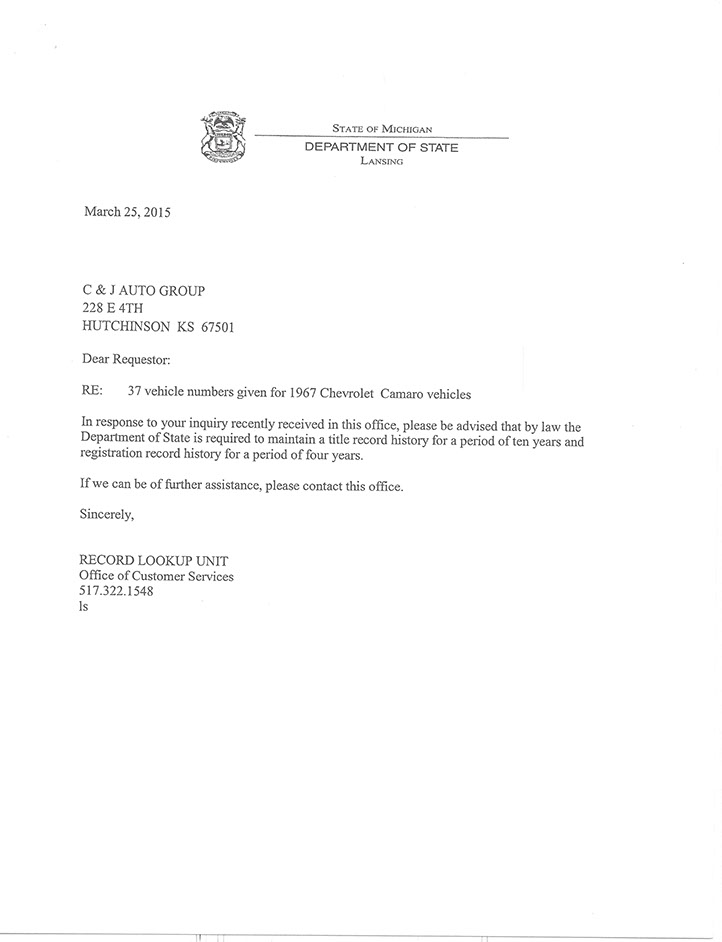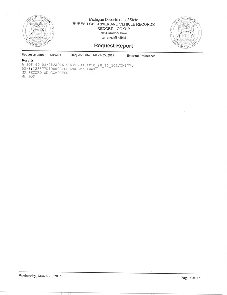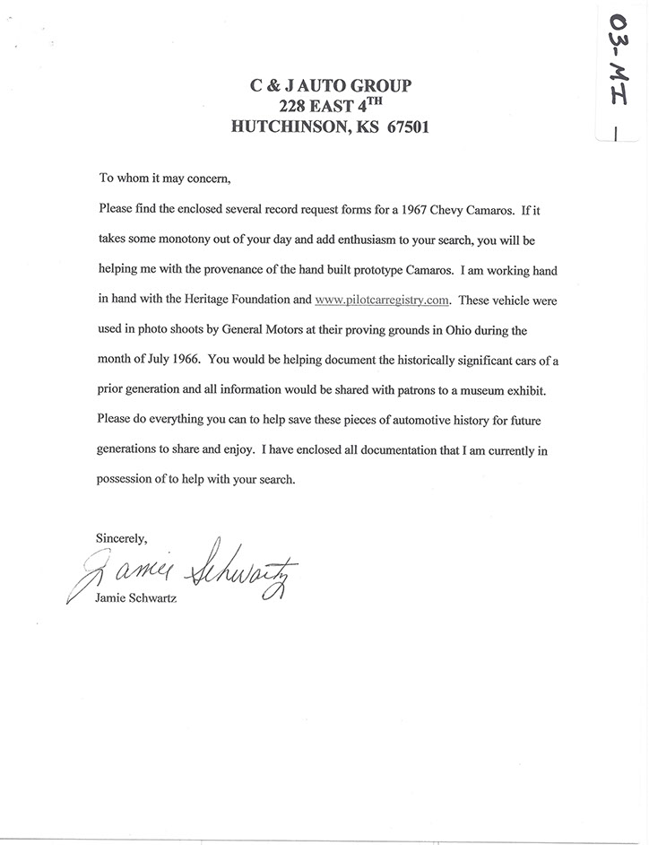 N100003, “The 250 6-Cylinder Power-Glide Test Car”, was delivered on May 23, 1966 from Fisher Body as coach #DD05D. Like all F-Body Pilot Prototypes at Norwood, it started its hand built assembly in consecutive VIN number order as the third build of the engineering study. One of one on Fleet and Special Order # 5-7 made by Engineering Testing, it carried model # 12537. This white on black coupe was the second coupe ever built. With a 250 cubic inch power plant and a power-glide automatic transmission, its presence at the Detroit General Motors unveil makes it a highly significant piece of Camaro history. It was required to be received by C. Caswell at the General Motors Proving Grounds on or around June 7, 1966 for testing, but was shipped three days early. NCRS certificates show #3 being returned to corporate, Zone 0 and it is thought to have been used as a company promotional vehicle shortly thereafter. Extensive and exhaustive history searches have gleaned no documented ownership history. Current whereabouts and