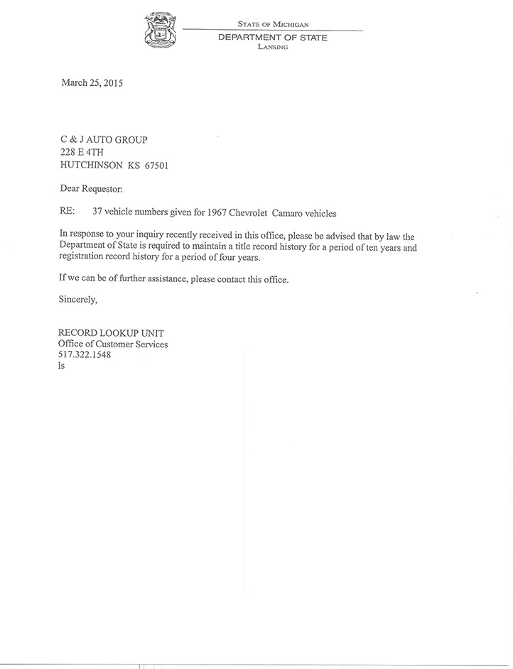 N100005, “The 230 6-Cylinder 3-Speed Test Car”, was delivered on May 25, 1966 from Fisher Body as coach #DD04D. Like all F-Body Pilot Prototypes at Norwood, it started its hand built assembly in consecutive VIN number order as the fifth build of the engineering study. One of one on Fleet and Special Order # 5-4 made by Engineering Testing it carried model # 12367. This black on red convertible was the second convertible ever built. With a 230 cubic inch power plant and a standard 3-speed transmission, its lack of presence in photo shoots at General Motors proving grounds make it an elusive piece of Camaro history. It was required to be received by C. Caswell at the General Motors Proving Grounds on or around June 9, 1966 for testing, but was shipped one day early. NCRS certificates show #5 being returned to corporate, Zone 0 and it is thought to be used as a company promotional vehicle shortly thereafter. Extensive and exhaustive history searches have gleaned no documented ownership history. Current whereabouts and existence is unknown as of 3-1-2015.