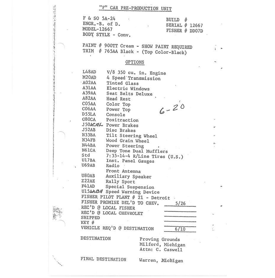 N100007, “The Mario Andretti Magazine Road Test Car”, was delivered on May 26, 1966 from Fisher Body as coach #DD07D. Like all F-Body Pilot Prototypes at Norwood, it started its hand built assembly in consecutive VIN number order as the seventh build of the engineering study. One of one on Fleet and Special Order # 5A-24 made by Engineering Body of Design, it carried model # 12667. This cream on black convertible was the third Camaro convertible ever built and the first with high performance options. With a 350 cubic inch power plant and a standard 4-speed transmission, its presence in General Motors Proving Grounds photo shoots, as well as, its documented use as the Mario Andretti Magazine Road Test Car…. this is the most historically significant piece of early high performance Camaro history. It was required to be received by C. Caswell at the General Motors Proving Grounds on or around June 10, 1966 for testing, but was shipped ten days late. NCRS certificates show #7 being returned to corporate, Zone 0 and it is thought to have been used as a company promotional vehicle shortly thereafter. Current whereabouts and existence is confirmed to exist as of 3-1-2015.