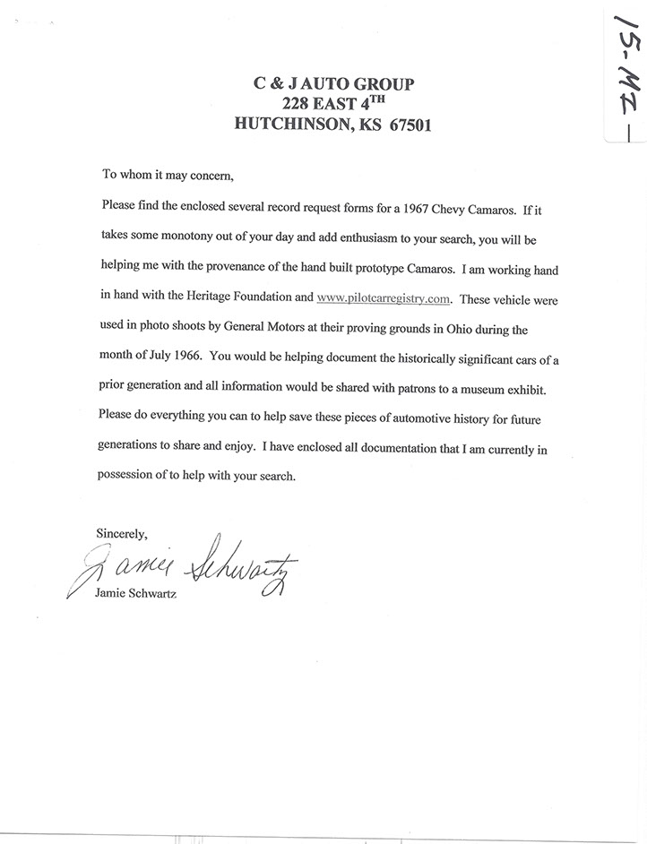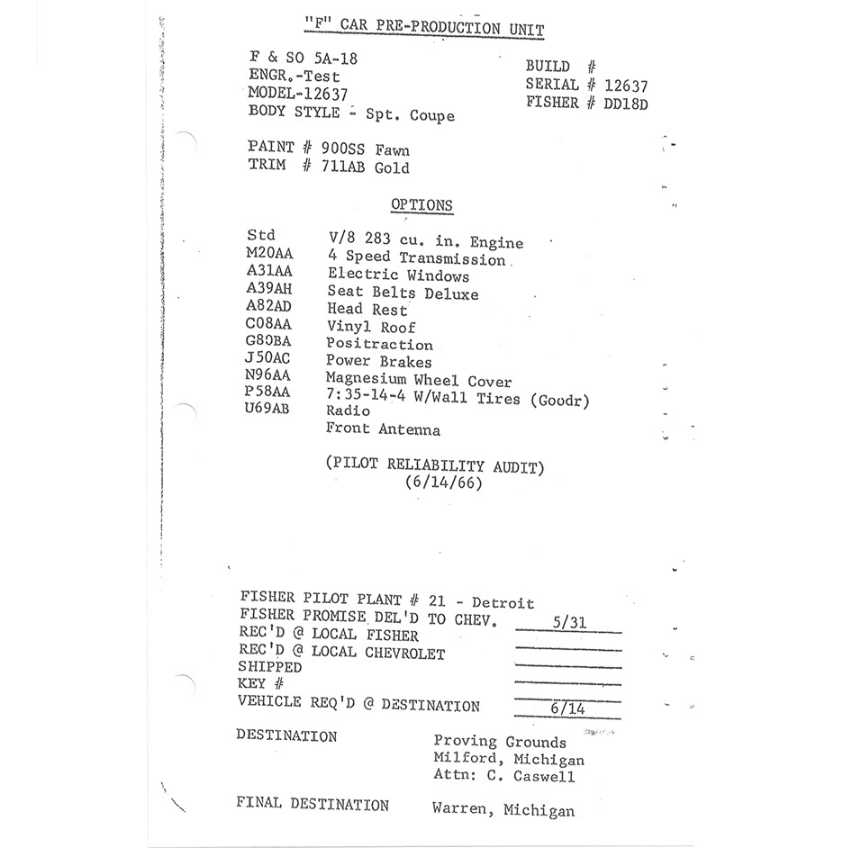 N100015, “The Crash Safety Car”, was delivered on May 31, 1966 from Fisher Body as coach #DD18D. Like all F-Body Pilot Prototypes at Norwood, it started its hand built assembly in consecutive VIN number order as the fifteenth build of the engineering study. One of one on Fleet and Special Order # 5A-18 made by Engineering Testing, it carried model # 12637. This fawn with gold coupe was the tenth coupe ever built. With a 283 cubic inch power plant and a standard 4-speed transmission, its lack of presence in photo shoots at General Motors proving grounds make it an elusive piece of Camaro history. It was required to be received by C. Caswell at the General Motors Proving Grounds on or around June 14, 1966 for testing. NCRS certificates show #15 being returned to corporate, Zone 0 and the feasibility of its existence is currently unknown. Extensive and exhaustive history searches have gleaned no documented ownership history. Current whereabouts and existence is unknown as of 3-1-2015.