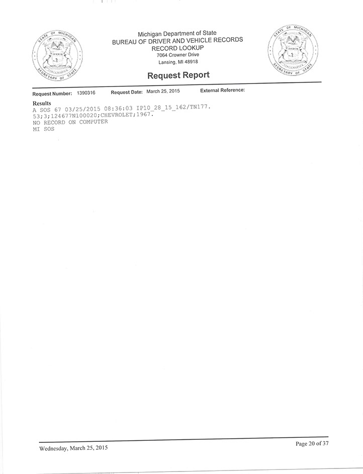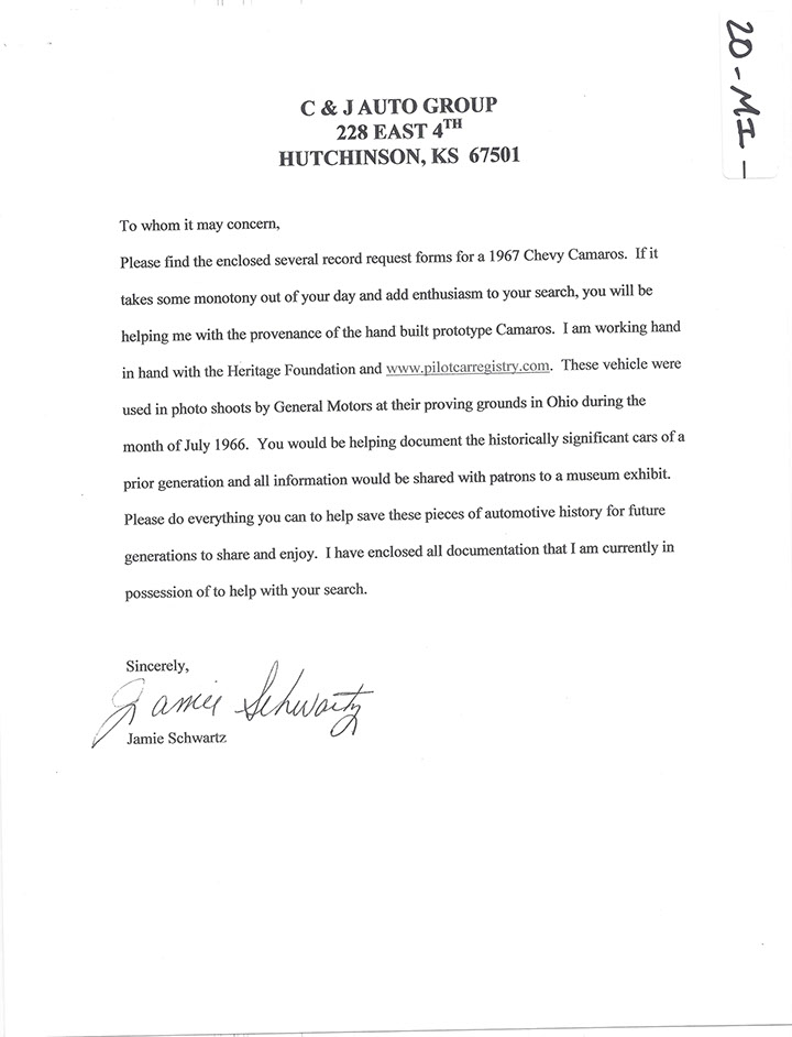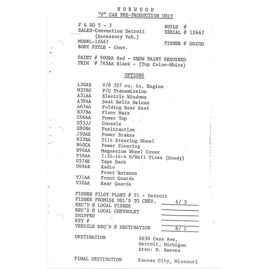 N100020, “The Accessory Detroit Convention Unveil Car”, was delivered on June 3, 1966 from Fisher Body as coach #DD20D. Like all F-Body Pilot Prototypes at Norwood, it started its hand built assembly in consecutive VIN number order as the twentieth build of the engineering study. One of three on Fleet and Special Order # 5-3 made by Sales Convention Detroit, it carried model # 12667. This red on black convertible was the seventh Camaro convertible ever built. With a 327 cubic inch power plant and a power-glide automatic transmission, its presence in the latter portion of the General Motors Jam Handy Video with Bob Lund, Assistant General Sales Manager narration, make this an impressive piece of early Camaro history. It was required to be received by D. Reeves at the General Motors Tech Center on or around August 1, 1966 for photo shoots and video, but was shipped seven days late. Because of the extremely late “Vehicle Required at Destination” date, our research and interviews have shown that all Pilot Prototypes still in storage at the Pilot Prototype facility were used as assembly test mules. NCRS certificates show #20 being returned to corporate, Zone 0 and it is thought to have been used as a company promotional vehicle shortly thereafter. Extensive and exhaustive history searches have gleaned no documented ownership history. Current whereabouts and existence is unknown as of 3-1-2015.
