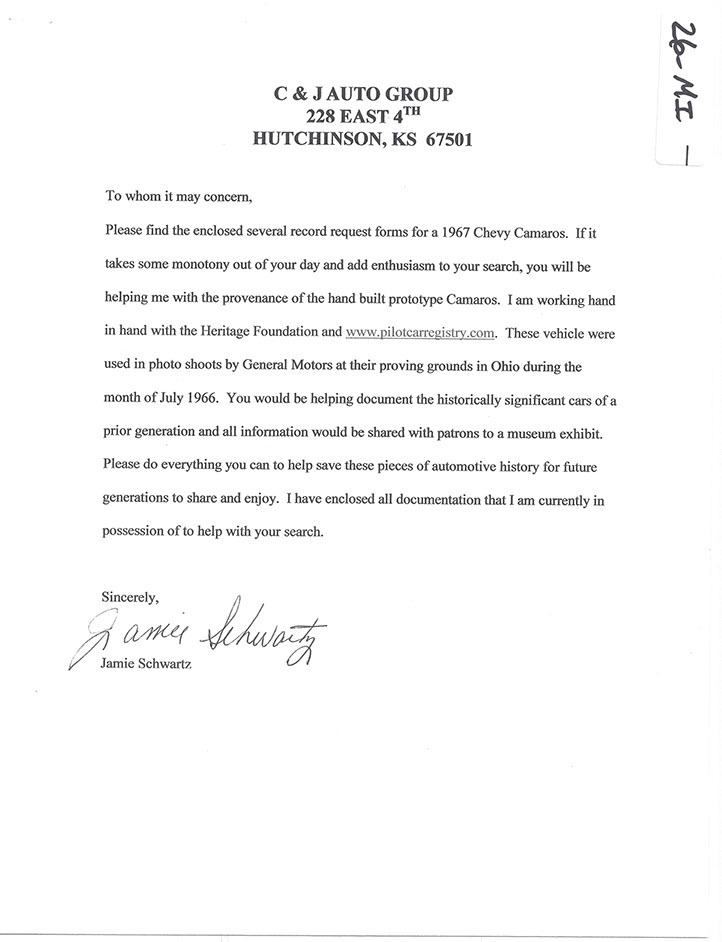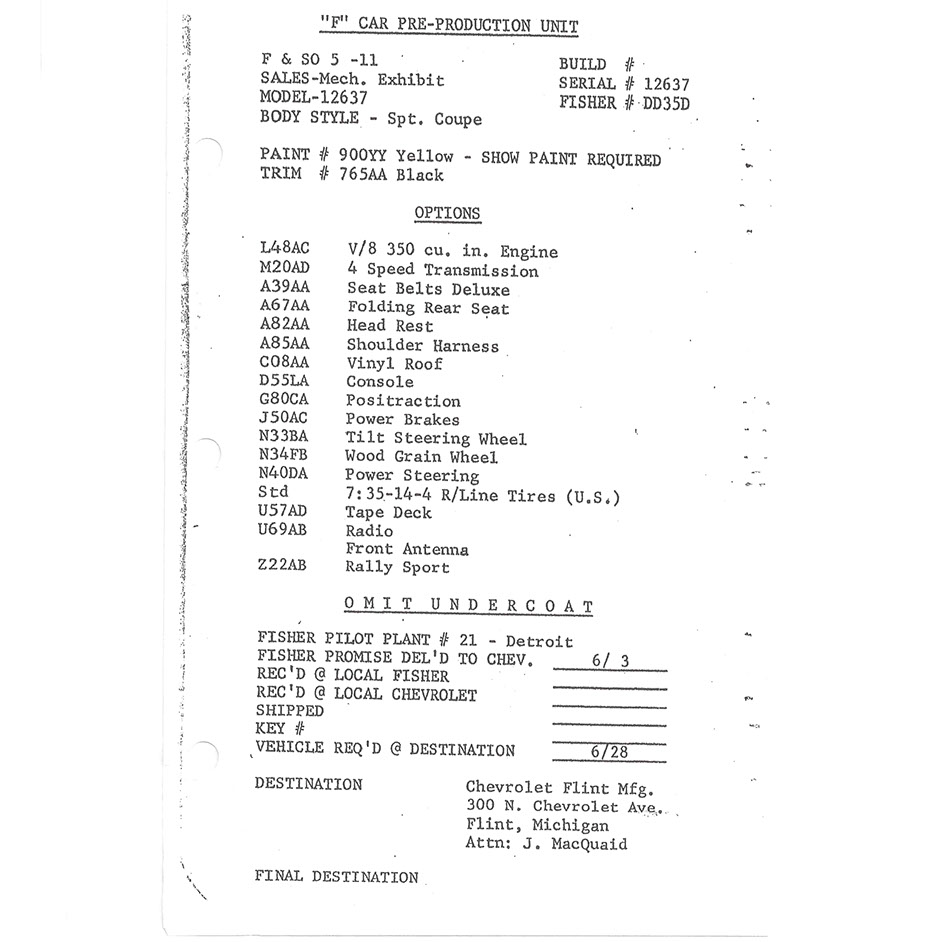 N100026, “The #2 Ride & Drive Car”, was delivered on June 3, 1966 from Fisher Body as coach #DD35D. Like all F-Body Pilot Prototypes at Norwood, it started its hand built assembly in consecutive VIN number order as the twenty-sixth build of the engineering study. One of eleven on Fleet and Special Order # 5-11 made by Sales Mechanical Exhibit, it carried model # 12637. This yellow on black coupe was the eighteenth coupe ever built and the “Second Ride & Drive Car”. With a 350 cubic inch power plant and a standard 4-speed transmission, its extensive use as a press tool was exhaustive. The “Ride & Drive Cars” could be checked out by the press for a hands on experience that complemented their reviews in magazines and newspapers. It was required to be received by J. MacQuaid at Chevrolet Flint Manufacturing on or around June 28, 1966 for testing. Like all of the eleven builds for the mechanical exhibit it was built “Omit Undercoat” for ease and desirability of publicity photos. NCRS certificates show #26 being returned to corporate, Zone 0 and it is thought to have been used as a company promotional vehicle shortly thereafter. Extensive and exhaustive history searches have gleaned no documented ownership history. Current whereabouts and existence is unknown as of 3-1-2015.