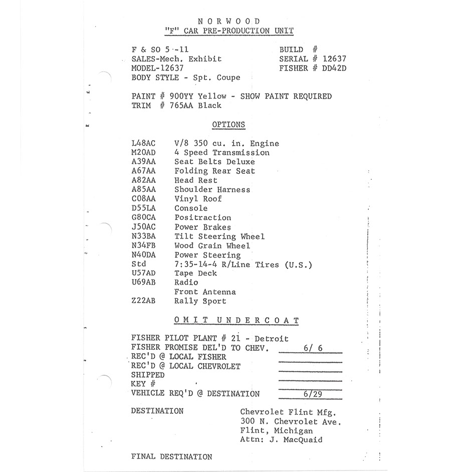 N100032, “The #3 Ride & Drive Car”, was delivered on June 6, 1966 from Fisher Body as coach #DD42D. Like all F-Body Pilot Prototypes at Norwood, it started its hand built assembly in consecutive VIN number order as the thirty-second build of the engineering study. One of eleven on Fleet and Special Order # 5-11 made by Sales Mechanical Exhibit, it carried model # 12637. This yellow on black coupe was the twenty-second coupe ever built and the “Third Ride & Drive Car”. With a 350 cubic inch power plant and a standard 4-speed transmission, its extensive use as a press tool was exhaustive. The “Ride & Drive Cars” could be checked out by the press for a hands on experience that complemented their reviews in magazines and newspapers. It was required to be received by J. MacQuaid at Chevrolet Flint Manufacturing on or around June 29, 1966 for testing. Like all of the eleven builds for the mechanical exhibit it was built “Omit Undercoat” for ease and desirability of publicity photos. NCRS certificates show #32 being returned to corporate, Zone 0 and it is thought to have been used as a company promotional vehicle shortly thereafter. Extensive and exhaustive history searches have gleaned no documented ownership history. Current whereabouts and existence is unknown as of 3-1-2015.