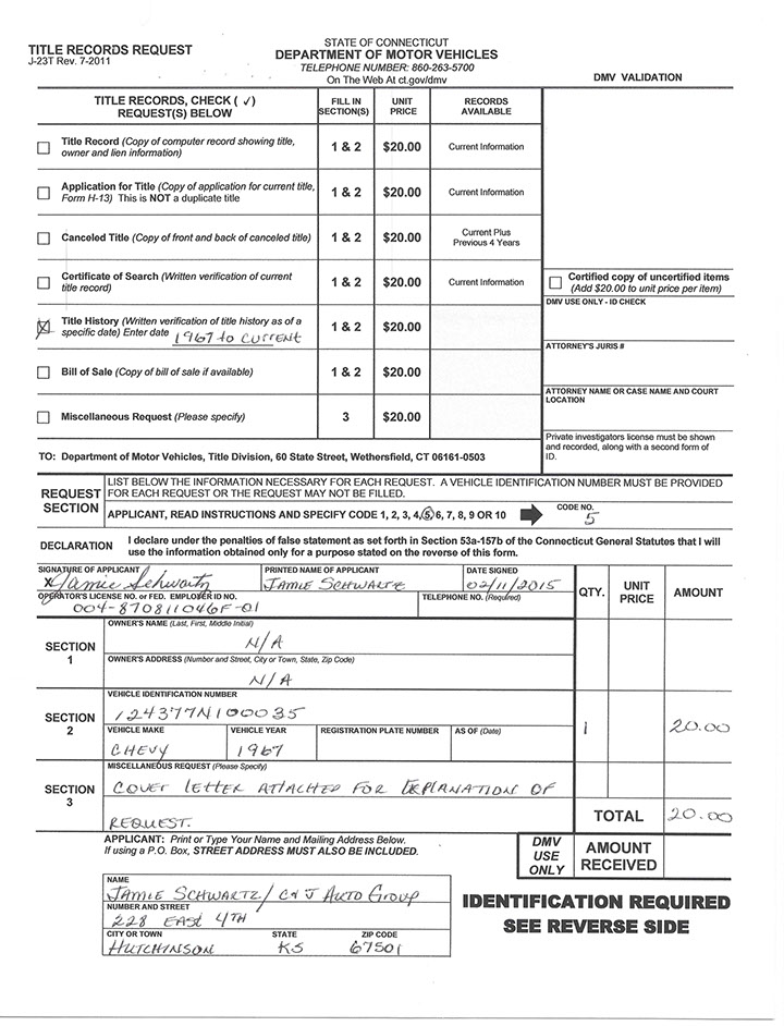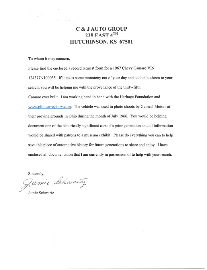 N100035, “The Super Sport Chicago Convention Car”, was delivered on June 6, 1966 from Fisher Body as coach #DD58D. Like all F-Body Pilot Prototypes at Norwood, it started its hand built assembly in consecutive VIN number order as the thirty-fifth build of the engineering study. One of three on Fleet and Special Order # 5-12 made by Sales Convention Chicago, it carried model # 12637. This turquoise on black coupe was the twenty-fifth Camaro coupe ever built. With a 350 cubic inch power plant and a standard 4-Speed transmission, its lack of presence in General Motors photo shoots make this an elusive piece of early Camaro history. It was required to be received by J.C. Stephens at Chevrolet Janesville in Wisconsin on or around August 8, 1966 for photo shoots. Because of the extremely late “Vehicle Required at Destination” date, our research and interviews have shown that all Pilot Prototypes still in storage at the Pilot Prototype facility were used as assembly test mules. NCRS certificates show #35 being shipped to the Dworkin Chevrolet, Zone 2. Extensive and exhaustive history searches have gleaned no documented ownership history. Current whereabouts and existence is unknown as of 3-1-2015.
