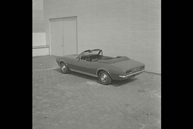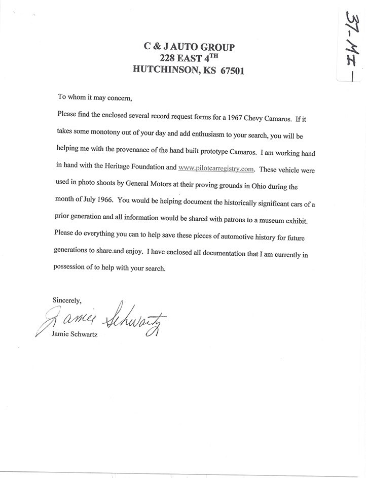 N100037, “The 350 4-Speed Test Car”, was delivered on June 6, 1966 from Fisher Body as coach #DD53D. Like all F-Body Pilot Prototypes at Norwood, it started its hand built assembly in consecutive VIN number order as the thirty-seventh build of the engineering study. One of one on Fleet and Special Order # 5A-22 made by Engineering Testing, it carried model # 12667. This color change turquoise on turquoise convertible was the eleventh Camaro convertible ever built and the second with high performance options. With a 350 cubic inch power plant and a standard 4-speed transmission, its extensive presence in General Motors Proving Grounds photo shoots make it the most photographed build of the pilot program. With the high concentration of color changes before and after this build in the pilot book, our research shows this build as an un-notated color change. This is an important piece of early high performance Camaro history. It was required to be received by C. Caswell at the General Motors Proving Grounds on or around June 20, 1966 for testing. NCRS certificates show #37 being returned to corporate, Zone 0 and it is thought to have been used as a company promotional vehicle shortly thereafter. Extensive and exhaustive history searches have gleaned no documented ownership history. Current whereabouts and existence is unknown as of 3-1-2015.