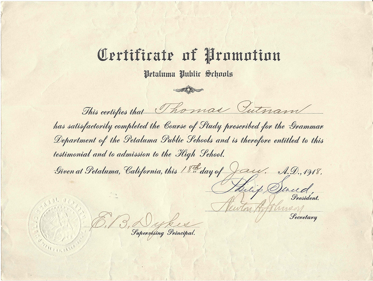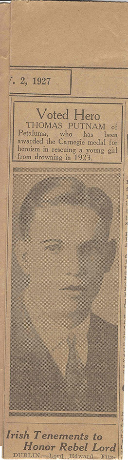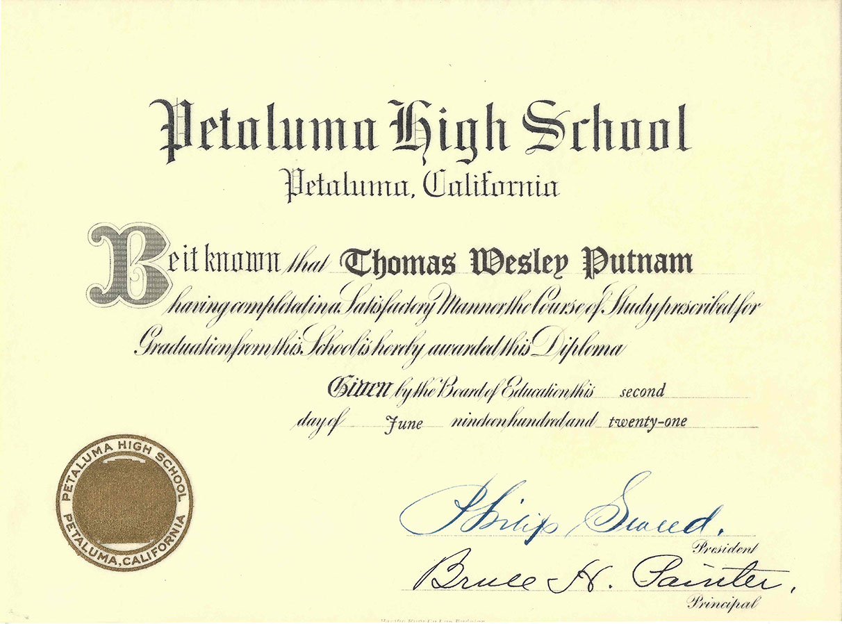 Tom Putnam was born on the family ranch in Petaluma, California on June 23, 1903. He had two younger brothers: John who became a professor of engineering at California Berkeley and his youngest brother, Rutherford who would ultimately own the local GM dealership in Petaluma later in life. Rutherford's wife, Helen, would later serve as mayor of Petaluma and reside on the Board of the Golden Gate Bridge. The father of the boys died in 1915, so they were raised alone by their mother who was