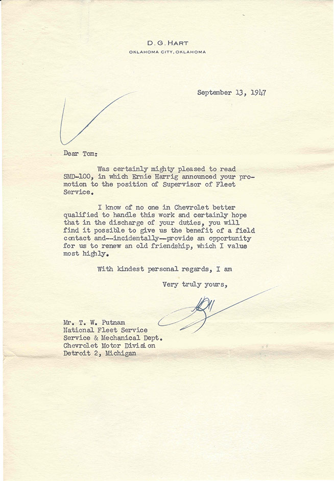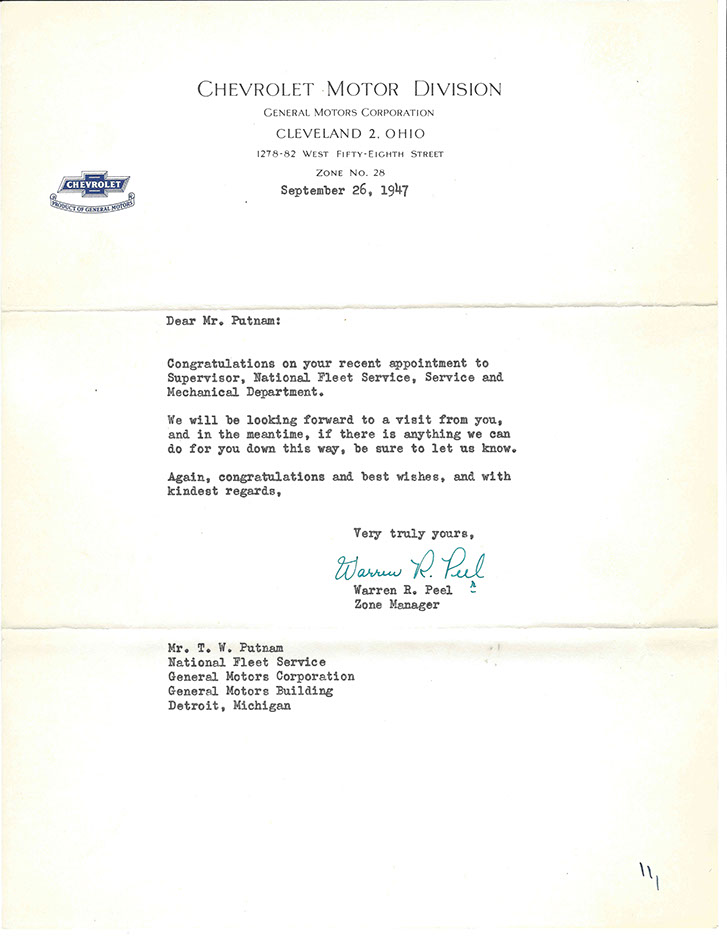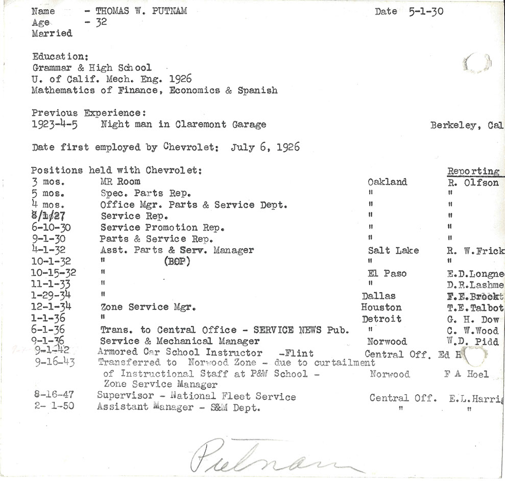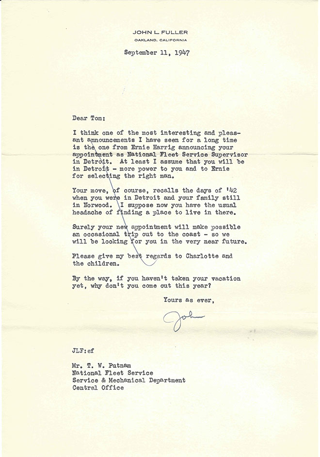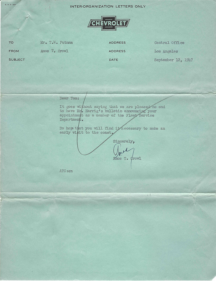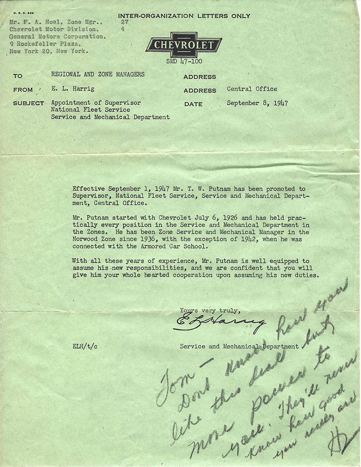 After the war, Tom was promoted to National Service Director and remained in Detroit. His image graces many historical documents and General Motors functions throughout his tenure.