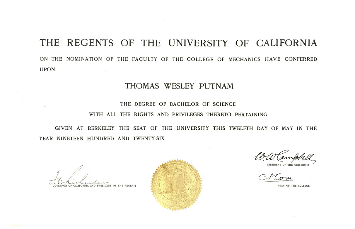 Tom attended the University of California Berkeley and majored in Mechanical Engineering. It was there that he met the love of his life, Charlotte and the two were married on June 6, 1928. While at Berkeley as a freshman, Tom saved a young girl from drowning in the treacherous waters of Tomales Bay, outside of the Golden Gate Bridge. This act of heroism earned him the distinction of receiving the Andrew Carnegie Medal of Heroism three years later. In addition to receiving the highest honor allowed to a civilian in peace time, he received the sum of $5,000.00 from the Carnegie Trust. Adjusted for inflation, this was enough money for quite a home in 1927. The inside joke among the family was that Tom struggled financially to pay for school and now that his degree was obtained, he had struggled in vain.