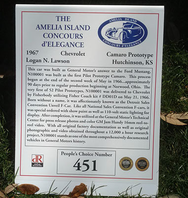Pilot Car Registry was sponsored by Chevrolet to showcase our research and display at the 22nd Annual Amelia Island Concours d'Elegance. This was by far the most prestigious honor that a Camaro could achieve in the world of car shows. It was held on Sunday, March 12, 2017 at The Golf Club of Amelia Island. In addition to this great honor, Car Fix from Velocity Channel did an interview that aired nationwide in their sixth season as the sixth episode. With the 50th anniversary of the birth of the Camaro being celebrated in 2017......this recognition from Chevrolet and the wonderful men and women of Amelia Island, make this our crowning achievement. Many thanks go out to everyone that donated their time and efforts to make this happen.