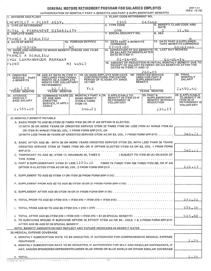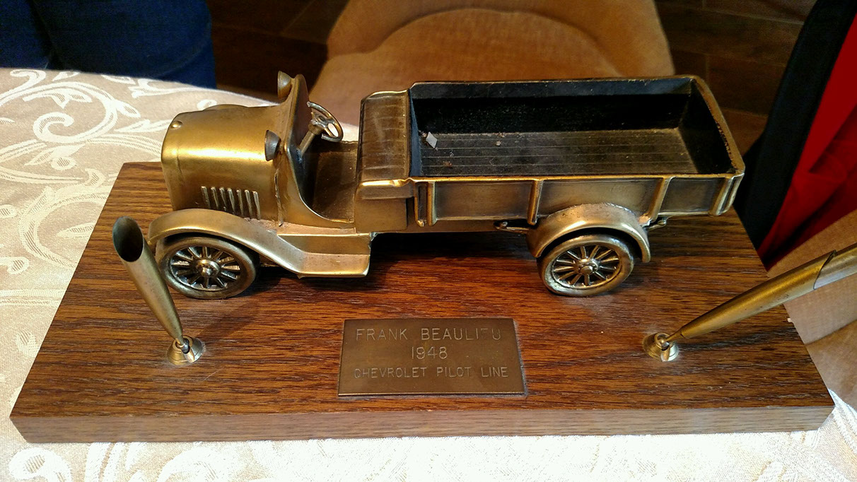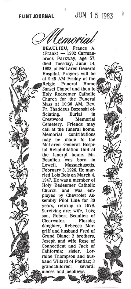 France A. Beaulieu…..lovingly known by friends and family as “Frank”, was born in Lowell, Massachusetts in 1926. At the age of 19, Frank joined the Navy and was ranked the aviation storekeeper third class and earned a World War II Victory Medal. Rebecca, Frank’s daughter, described her dad as a character who had a great sense of humor. She tells about her dad going into a bar while on leave from the Navy and planting a kiss on the first beautiful girl he saw. That was Lois, Rebecca’s mother…..and they married in 1947 and had two children. After the war, Frank’s uncle…who worked in Personnel at General Motors, arranged for Frank to begin on the assembly line. Rising rapidly to the top, Frank began on the Pilot Line in 1948. Frank earned the distinction of “Mr. Pilot Line” by the time the F-car was introduced. His letter and signature graces the introduction page of the Pilot Book. Frank was in charge of the Specifications Division, but wore many hats during the Pilot Prototype Build. He was the decision maker in charge of build configurations, build orders, fleet and special orders, and ultimately…..what divisions received the early prototypes to effectively do their respective jobs. In a nutshell, he was in charge of orchestrating the program before and after the Pilot Prototype’s builds. An extensive photographic history is included. Please note the Pilot Prototype Build Board located on the wall behind his desk. After 30 years of employment, Frank retired in 1979. Unfortunately, in 1983, Frank passed away after a lengthy illness. He was loved by many and played an important role in the development of the car we now know as the “Camaro”. He is buried in Crestwood Memorial cemetery in Grand Blanc, Michigan and survived by his loving daughter….Rebecca Margriff, who was interviewed on May 13, 2015.