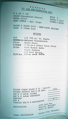 While at Norwood, N100001 was used as a chassis side (Chevrolet) assembly test mule as one would expect with the first “F” car produced. Its first and original 230 cubic inch engine, 3-speed transmission, one of the very last items installed in the car, came right out of standard assembly stock for that time with a motor build date of August 3rd, 1966. The date on the original motor was quite a mystery for a short time as the Pilot Prototype data book for N100001 indicated a preference ship date as 8-1-66. Additional research with the NCRS, however, quickly solved this mystery as the NCRS official “production record”(generated directly from the original GM shipping records) list the car with an official production date of 8-10-66, so the delivery date to the initial destination on Cass Avenue in Detroit was delayed by 10 days. A basic understanding of the relationship between the term ”official production date” and the relationship to the shipper date is required. The shipper date was the date when the car was considered “released to the shipper” and all production/repair was technically complete. This date had to be very accurate when the shipper took possession of the product; therefore the official production date designation