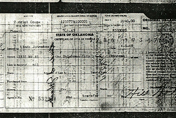 N100001 was sold to the first owner, Linda Johnston of Oklahoma City, two and half years later on April 5, 1969. Paying full sticker of $2550.00 at delivery with no liens, it is clear that she knew the allure of the car. It is thought that there was a family connection between her or her father and the Ayers family, because the two families are buried within 200 feet of one another in the same obscure cemetery outside of Yukon, Oklahoma. Miss Johnston enjoyed the car until December 5, 1975 when the car was sold to a dealer in Frederick, Oklahoma. Linda never married, was never blessed with children, lived her entire life with her parents in the same home,