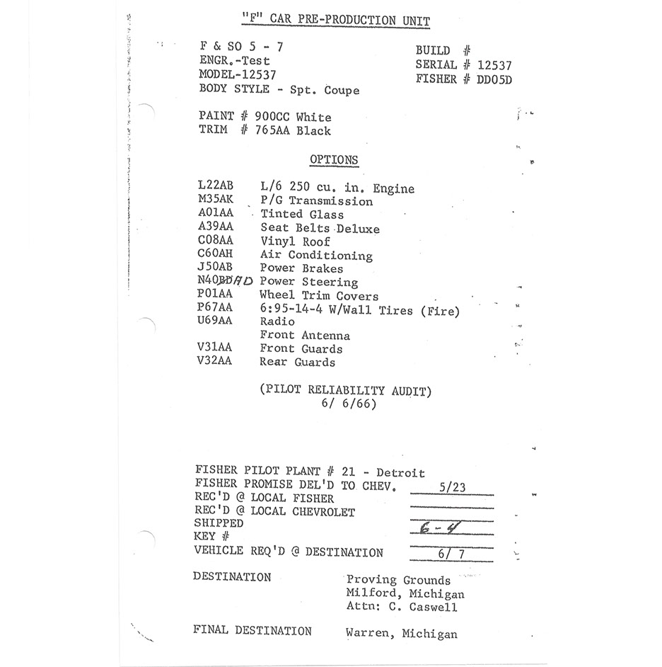 N100003, “The 250 6-Cylinder Power-Glide Test Car”, was delivered on May 23, 1966 from Fisher Body as coach #DD05D. Like all F-Body Pilot Prototypes at Norwood, it started its hand built assembly in consecutive VIN number order as the third build of the engineering study. One of one on Fleet and Special Order # 5-7 made by Engineering Testing, it carried model # 12537. This white on black coupe was the second coupe ever built. With a 250 cubic inch power plant and a power-glide automatic transmission, its presence at the Detroit General Motors unveil makes it a highly significant piece of Camaro history. It was required to be received by C. Caswell at the General Motors Proving Grounds on or around June 7, 1966 for testing, but was shipped three days early. NCRS certificates show #3 being returned to corporate, Zone 0 and it is thought to have been used as a company promotional vehicle shortly thereafter. Extensive and exhaustive history searches have gleaned no documented ownership history. Current whereabouts and