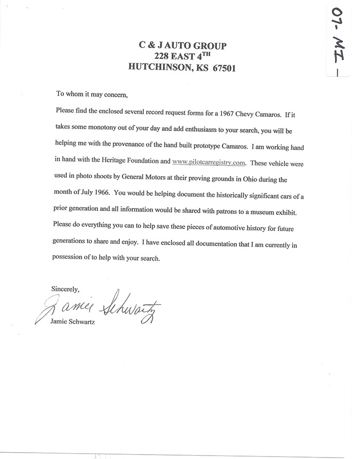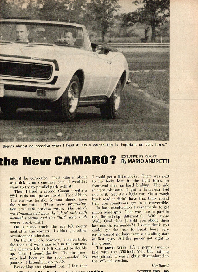 N100007, “The Mario Andretti Magazine Road Test Car”, was delivered on May 26, 1966 from Fisher Body as coach #DD07D. Like all F-Body Pilot Prototypes at Norwood, it started its hand built assembly in consecutive VIN number order as the seventh build of the engineering study. One of one on Fleet and Special Order # 5A-24 made by Engineering Body of Design, it carried model # 12667. This cream on black convertible was the third Camaro convertible ever built and the first with high performance options. With a 350 cubic inch power plant and a standard 4-speed transmission, its presence in General Motors Proving Grounds photo shoots, as well as, its documented use as the Mario Andretti Magazine Road Test Car…. this is the most historically significant piece of early high performance Camaro history. It was required to be received by C. Caswell at the General Motors Proving Grounds on or around June 10, 1966 for testing, but was shipped ten days late. NCRS certificates show #7 being returned to corporate, Zone 0 and it is thought to have been used as a company promotional vehicle shortly thereafter. Current whereabouts and existence is confirmed to exist as of 3-1-2015.