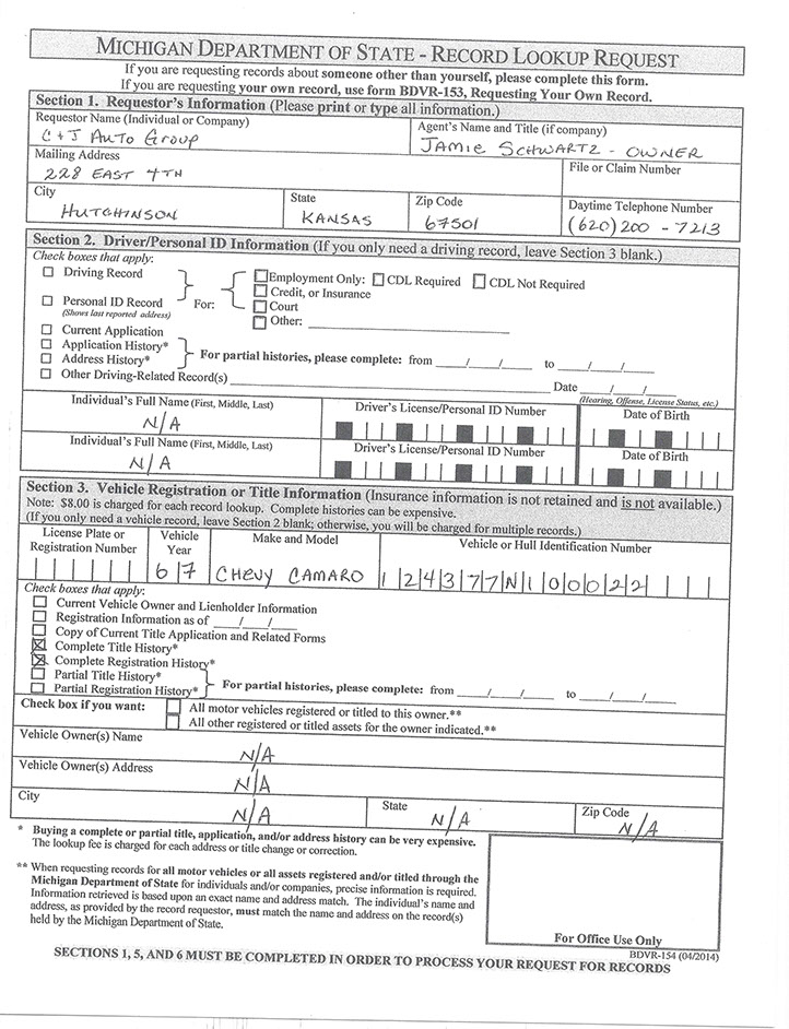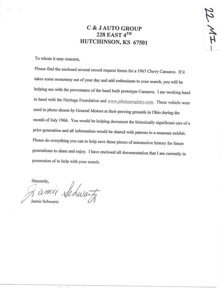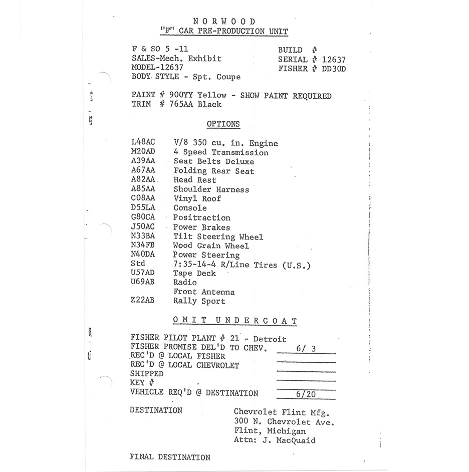N100022, “The #2 Magazine Test Photo Car”, was delivered on June 3, 1966 from Fisher Body as coach #DD30D. Like all F-Body Pilot Prototypes at Norwood, it started its hand built assembly in consecutive VIN number order as the twenty-second build of the engineering study. One of eleven on Fleet and Special Order # 5-11 made by Sales Mechanical Exhibit, it carried model # 12637. This yellow on black coupe was the fifteenth coupe ever built and the “Second Magazine & Newspaper Test Photo Car”. With a 350 cubic inch power plant and a standard 4-speed transmission, its extensive use as a press tool was exhaustive. The “Magazine Test Photo Cars” were on elevated display for ease of photography in the same program as the “Ride & Drive Cars”. It was required to be received by J. MacQuaid at Chevrolet Flint Manufacturing on or around June 20, 1966 for display use. Like all of the eleven builds for the mechanical exhibit it was built “Omit Undercoat” for ease and desirability of publicity photos. NCRS certificates show #22 being returned to corporate, Zone 0 and it is thought to have been used as a company promotional vehicle shortly thereafter. Extensive and exhaustive history searches have gleaned no documented ownership history. Current whereabouts and existence is unknown as of 3-1-2015.