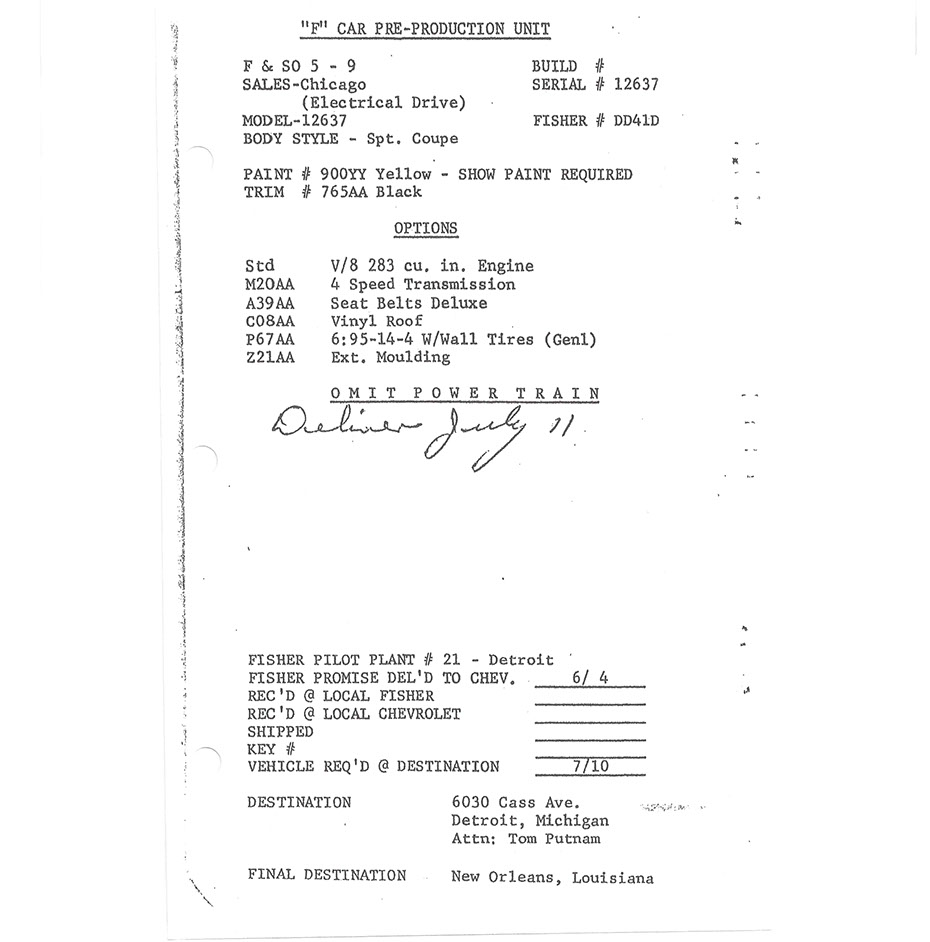 N100029, “The #1 Emblem Test Electro-Maro Car”, was delivered on June 4, 1966 from Fisher Body as coach #DD41D. Like all F-Body Pilot Prototypes at Norwood, it started its hand built assembly in consecutive VIN number order as the twenty-ninth build of the engineering study. One of four on Fleet and Special Order # 5-9 made by Sales Convention Chicago, it carried model # 12637. This yellow on black coupe was the twentieth Camaro coupe ever built. With all four Electrical Drive builds being ordered as “Omit Powertrain”, our research shows all four being delivered to the Technical Center approximately three weeks ahead of schedule. This is derived from dated photos of the #5-9 build at the Technical Center, average elapsed time for all Pilot Prototypes at the Pilot Prototype facility, and the lack of storage space and allotted electrical drive build time. During the initial mock-up of #28…, #29, #30 and #49 were used in a Test Emblem Photographic Study. All three photographic studies were trimmed like XP-836 at the Tech Center. These three photo shoots were taken by GM Styling on a brisk Monday morning, June 20, 1966. It was these three photo studies, some passing muster… others not, that ultimately led to the primary choice of the name Camaro a week later. As evidence in the photos, The Name Panther was passed over, but other aspects were retained. This was the same electrical mock-up program that brought us the Electro-Vaire. Additionally, these photographic studies were the last emblem study prior to General Motor's final expense of $100,000.00 for tooling derived from the name choice. Delivered from the pilot program "Omit Powertrain", it can be evidenced in these photos with the clutch pedal missing, fake mock up Rally Sport / Super Sport adornments, and electrical elements hanging from the sub-frame. This information was uncovered recently and is being released to the public for the first time by this website. Prior to this release, no such program was known to exist. A special thanks to the General Motors Heritage Center, our research team, and all interviewees arranged by author Phil Borris. These four electrical drive builds are the single most historical technical builds in Camaro history. NCRS certificates show #29 being returned to corporate, Zone 0 and it is thought to have been used as a company promotional vehicle shortly after the removal of the “Electric-Drive” unit. Extensive and exhaustive history searches have gleaned no documented ownership history. Current whereabouts and existence is unknown as of 3-1-2015. Only two of the Electro-Maro of the four builds is known to exist. The full story of these four builds can be accessed by the link below.