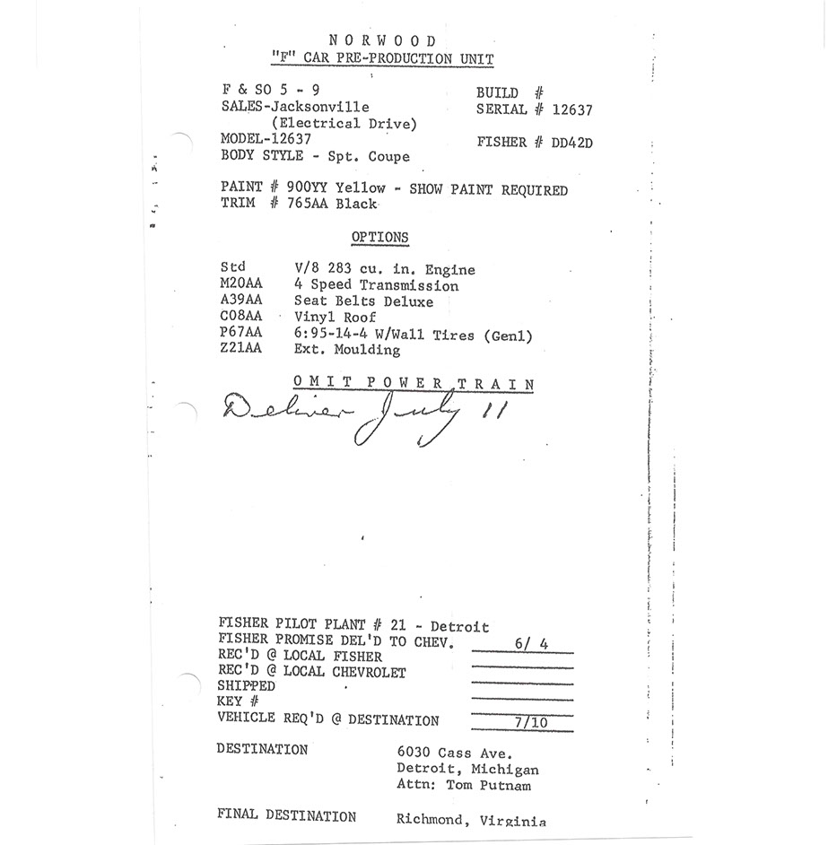 N100030, “The #2 Emblem Test Electro-Maro Car”, was delivered on June 4, 1966 from Fisher Body as coach #DD42D. Like all F-Body Pilot Prototypes at Norwood, it started its hand built assembly in consecutive VIN number order as the thirtieth build of the engineering study. One of four on Fleet and Special Order # 5-9 made by Sales Convention Jacksonville, it carried model # 12637. This yellow on black coupe was the twenty-first Camaro coupe ever built. With all four Electrical Drive builds being ordered as “Omit Powertrain”, our research shows all four being delivered to the Technical Center approximately three weeks ahead of schedule. This is derived from dated photos of the #5-9 build at the Technical Center, average elapsed time for all Pilot Prototypes at the Pilot Prototype facility, and the lack of storage space and allotted electrical drive build time. During the initial mock-up of #28…, #29, #30 and #49 were used in a Test Emblem Photographic Study. All three photographic studies were trimmed like XP-836 at the Tech Center. These three photo shoots were taken by GM Styling on a brisk Monday morning, June 20, 1966. It was these three photo studies, some passing muster… others not, that ultimately led to the primary choice of the name Camaro a week later. As evidence in the photos, The Name Panther was passed over, but other aspects were retained. This was the same electrical mock-up program that brought us the Electro-Vaire. Additionally, these photographic studies were the last emblem study prior to General Motor's final expense of $100,000.00 for tooling derived from the name choice. Delivered from the pilot program "Omit Powertrain", it can be evidenced in these photos with the clutch pedal missing, fake mock up Rally Sport / Super Sport adornments, and electrical elements hanging from the sub-frame. This information was uncovered recently and is being released to the public for the first time by this website. Prior to this release, no such program was known to exist. A special thanks to the General Motors Heritage Center, our research team, and all interviewees arranged by author Phil Borris. These four electrical drive builds are the single most historical technical builds in Camaro history. NCRS certificates show #30 being shipped to Dworkin Chevrolet, Zone 2, shortly after the removal of the “Electric-Drive” unit. Extensive and exhaustive history searches have gleaned no documented ownership history. Current whereabouts and existence is unknown as of 3-1-2015. Only two of the Electro-Maro of the four builds is known to exist. The full story of these four builds can be accessed by the link below.
