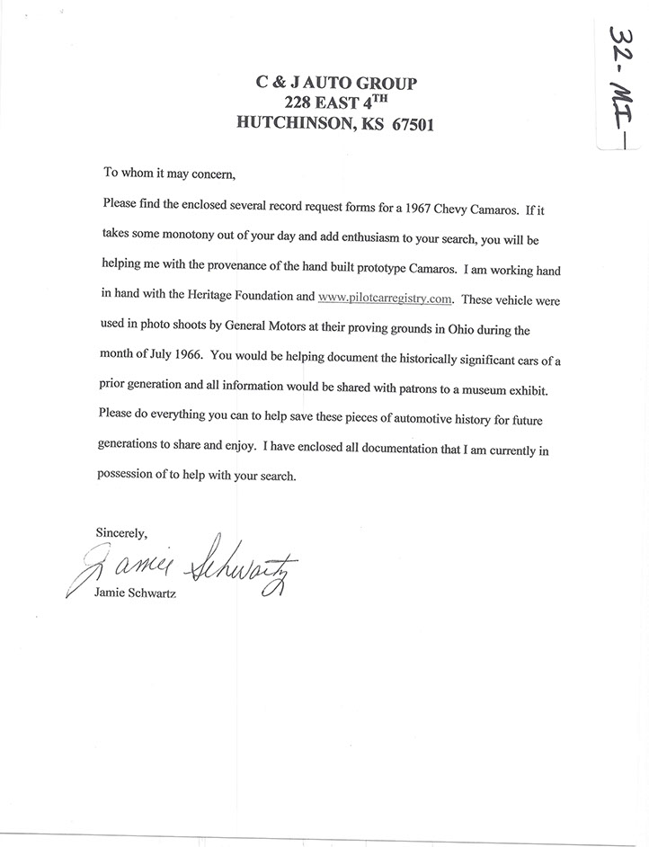 N100032, “The #3 Ride & Drive Car”, was delivered on June 6, 1966 from Fisher Body as coach #DD42D. Like all F-Body Pilot Prototypes at Norwood, it started its hand built assembly in consecutive VIN number order as the thirty-second build of the engineering study. One of eleven on Fleet and Special Order # 5-11 made by Sales Mechanical Exhibit, it carried model # 12637. This yellow on black coupe was the twenty-second coupe ever built and the “Third Ride & Drive Car”. With a 350 cubic inch power plant and a standard 4-speed transmission, its extensive use as a press tool was exhaustive. The “Ride & Drive Cars” could be checked out by the press for a hands on experience that complemented their reviews in magazines and newspapers. It was required to be received by J. MacQuaid at Chevrolet Flint Manufacturing on or around June 29, 1966 for testing. Like all of the eleven builds for the mechanical exhibit it was built “Omit Undercoat” for ease and desirability of publicity photos. NCRS certificates show #32 being returned to corporate, Zone 0 and it is thought to have been used as a company promotional vehicle shortly thereafter. Extensive and exhaustive history searches have gleaned no documented ownership history. Current whereabouts and existence is unknown as of 3-1-2015.