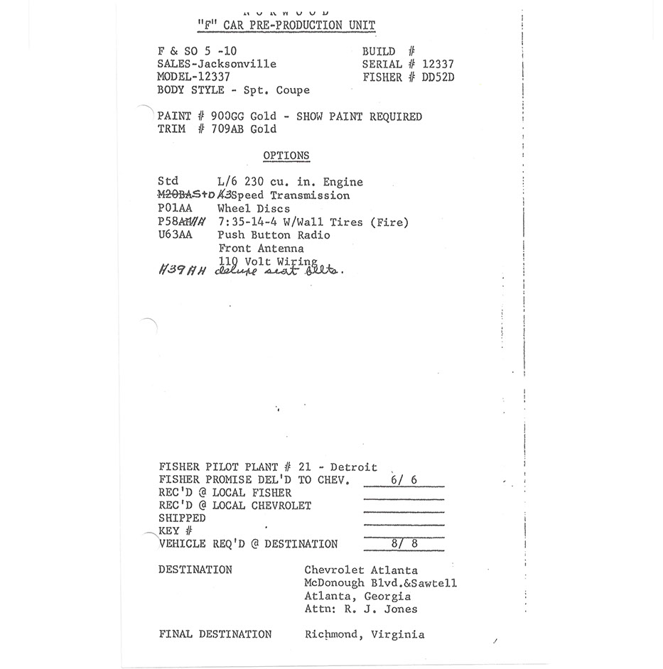 N100036, “The 6-Cylinder Jacksonville Convention Car”, was delivered on June 6, 1966 from Fisher Body as coach #DD52D. Like all F-Body Pilot Prototypes at Norwood, it started its hand built assembly in consecutive VIN number order as the thirty-sixth build of the engineering study. One of three on Fleet and Special Order # 5-10 made by Sales Convention Jacksonville, it carried model # 12337. This gold on gold coupe was the twenty-sixth Camaro coupe ever built. With a 230 cubic inch power plant and a standard 3-Speed transmission, its presence in General Motors photo shoots, its impressive ownership history, make this an important piece of early Camaro history. It was required to be received by R.J. Jones at Chevrolet Atlanta on or around August 8, 1966 for photo shoots. Because of the extremely late “Vehicle Required at Destination” date, our research and interviews have shown that all Pilot Prototypes still in storage at the Pilot Prototype facility were used as assembly test mules. NCRS certificates show #36 being shipped to R.T. Ayers Chevrolet, Zone 23. One of three Pilot Prototype builds ordered by Mr. Ayers… he holds the distinction of being the first Camaro collector to exist. Recognizing the significance of the hand built Pilot Prototypes, he requested and received the first and last build, as well as, #36. These cars sat on his showroom floor as part of his collection and were used to sell and promote the new model. He achieved this through his relationships with top brass at General Motors. A full biography of Mr. Ayers can be viewed on the N100001 video. Extensive and exhaustive history searches have gleaned all documented ownership history.