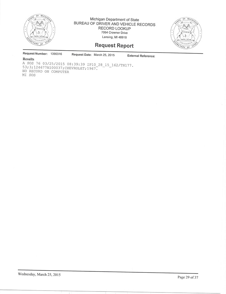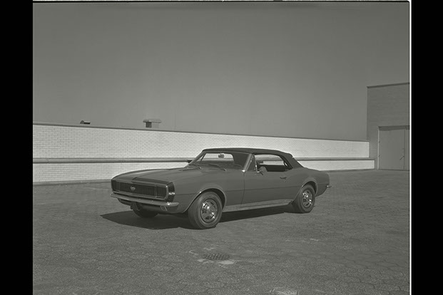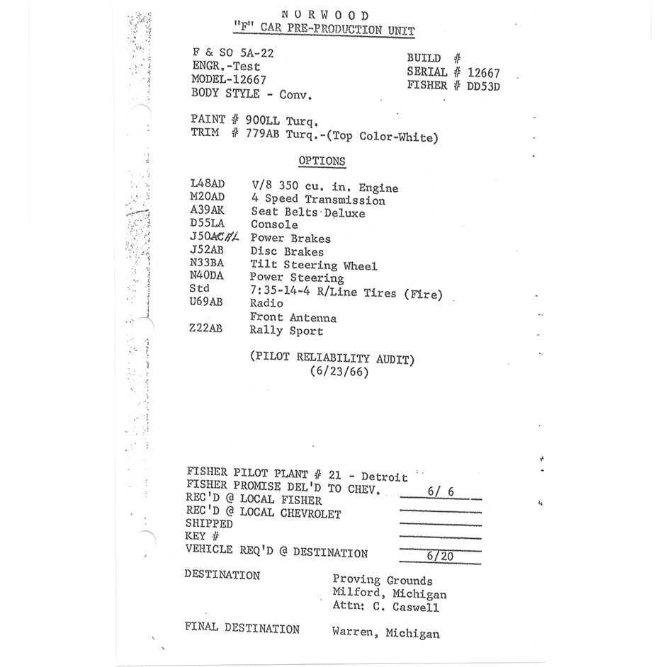 N100037, “The 350 4-Speed Test Car”, was delivered on June 6, 1966 from Fisher Body as coach #DD53D. Like all F-Body Pilot Prototypes at Norwood, it started its hand built assembly in consecutive VIN number order as the thirty-seventh build of the engineering study. One of one on Fleet and Special Order # 5A-22 made by Engineering Testing, it carried model # 12667. This color change turquoise on turquoise convertible was the eleventh Camaro convertible ever built and the second with high performance options. With a 350 cubic inch power plant and a standard 4-speed transmission, its extensive presence in General Motors Proving Grounds photo shoots make it the most photographed build of the pilot program. With the high concentration of color changes before and after this build in the pilot book, our research shows this build as an un-notated color change. This is an important piece of early high performance Camaro history. It was required to be received by C. Caswell at the General Motors Proving Grounds on or around June 20, 1966 for testing. NCRS certificates show #37 being returned to corporate, Zone 0 and it is thought to have been used as a company promotional vehicle shortly thereafter. Extensive and exhaustive history searches have gleaned no documented ownership history. Current whereabouts and existence is unknown as of 3-1-2015.