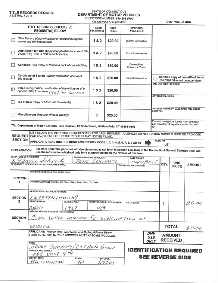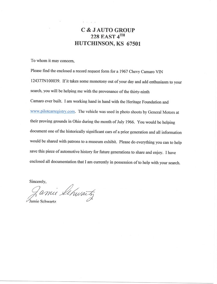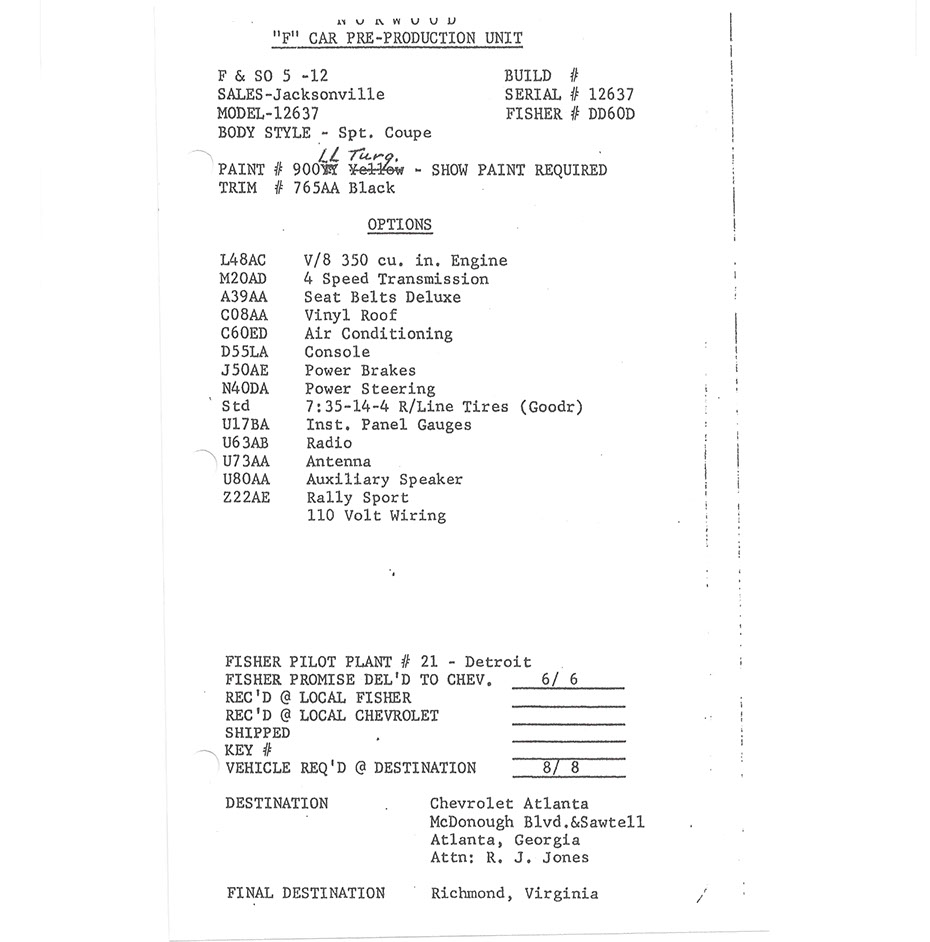 N100039, “The Super Sport Jacksonville Convention Car”, was delivered on June 6, 1966 from Fisher Body as coach #DD60D. Like all F-Body Pilot Prototypes at Norwood, it started its hand built assembly in consecutive VIN number order as the thirty-ninth build of the engineering study. One of three on Fleet and Special Order # 5-12 made by Sales Convention Jacksonville, it carried model # 12637. This turquoise on black coupe was the twenty-eighth Camaro coupe ever built. With a 350 cubic-inch power plant and a standard 4-speed transmission, its lack of presence in General Motors photo shoots make it an elusive piece of early Camaro history. It was required to be received by R.J. Jones at the Chevrolet Atlanta on or around August 8, 1966 for photo shoots. Because of the extremely late “Vehicle Required at Destination” date, our research and interviews have shown that all Pilot Prototypes still in storage at the Pilot Prototype facility were used as assembly test mules. NCRS certificates show #39 being shipped to Dworkin Chevrolet, Zone 2 and it is thought to have been used as a dealer promotional vehicle until being sold to the first owner. Extensive and exhaustive history searches have gleaned no documented ownership history. Current whereabouts and existence is unknown as of 3-1-2015.