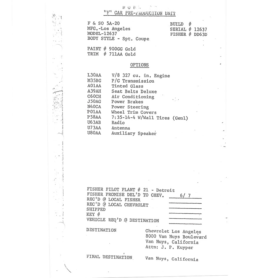 N100041, “The Kuyper L.A. Factory Manager Car”, was delivered on June 7, 1966 from Fisher Body as coach #DD63D. Like all F-Body Pilot Prototypes at Norwood, it started its hand built assembly in consecutive VIN number order as the forty-first build of the engineering study. One of four on Fleet and Special Order # 5A-20 made by Manufacturing-Los Angeles, it carried model # 12637. This gold on gold coupe was the thirtieth Camaro coupe ever built. With a 327 cubic-inch power plant and a power-glide automatic transmission, its lack of presence in General Motors photo shoots make this an elusive piece of early Camaro history. It was required to be received by J.P. Kuyper at Chevrolet Los Angeles at an unknown date. This build was ordered under the same fleet and special order # as the Pilot Prototype Assembly Research Cars. NCRS certificates show #41 being returned to Corporate, Zone 0 and it thought to have been used as a company promotional vehicle shortly thereafter. This is the most high profile example of the inefficiencies of the General Motors shipping receipts. It is more likely, that this car remained in California and was sold than returning to Corporate after its use by Kuyper. Extensive and exhaustive history searches have gleaned no documented ownership history. Current whereabouts and