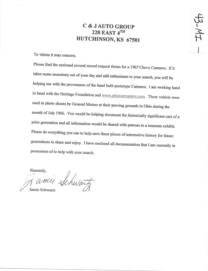 N100043, “The #1 Pilot Line Assembly Research Car”, was delivered on June 7, 1966 from Fisher Body as coach #DD65D. Like all F-Body Pilot Prototypes at Norwood, it started its hand built assembly in consecutive VIN number order as the forty-third build of the engineering study. One of four on Fleet and Special Order # 5A-20 made by Manufacturing-Pilot Line, it carried model # 12637. This gold on gold coupe was the thirty-second Camaro coupe ever built. With a 327 cubic-inch power plant and a power-glide automatic transmission, its lack of presence in General Motors photo shoots make this an elusive piece of early Camaro history. It was required to be received by F.R. Caffrey at General Motors Assembly Research at an unknown date. This build was ordered under the same fleet and special order # as the two plant manager cars. Our research and interviews show that these two builds were not used for research as their titles imply. Instead, they were used as promotional vehicles by the assembly research managers. Their late build sequence and lack of urgency at their destination substantiates our research. In fact, the majority of all research for this engineering study was conducted on site at Norwood. This differentiates these builds from other Pilot programs. NCRS certificates show #43 being returned to Corporate, Zone 0 and it is thought to have been used as a company promotional vehicle shortly thereafter. Extensive and exhaustive history searches have gleaned no documented ownership history. Current whereabouts and existence is unknown as of 3-1-2015.