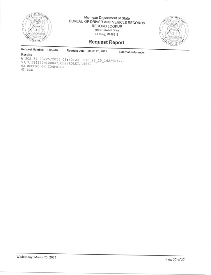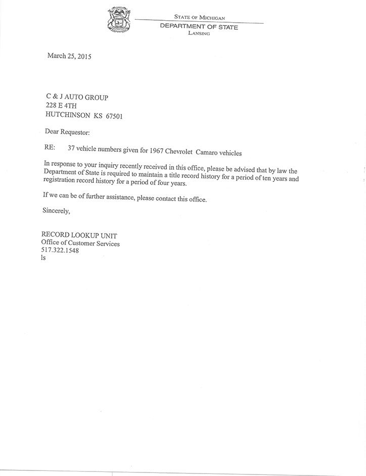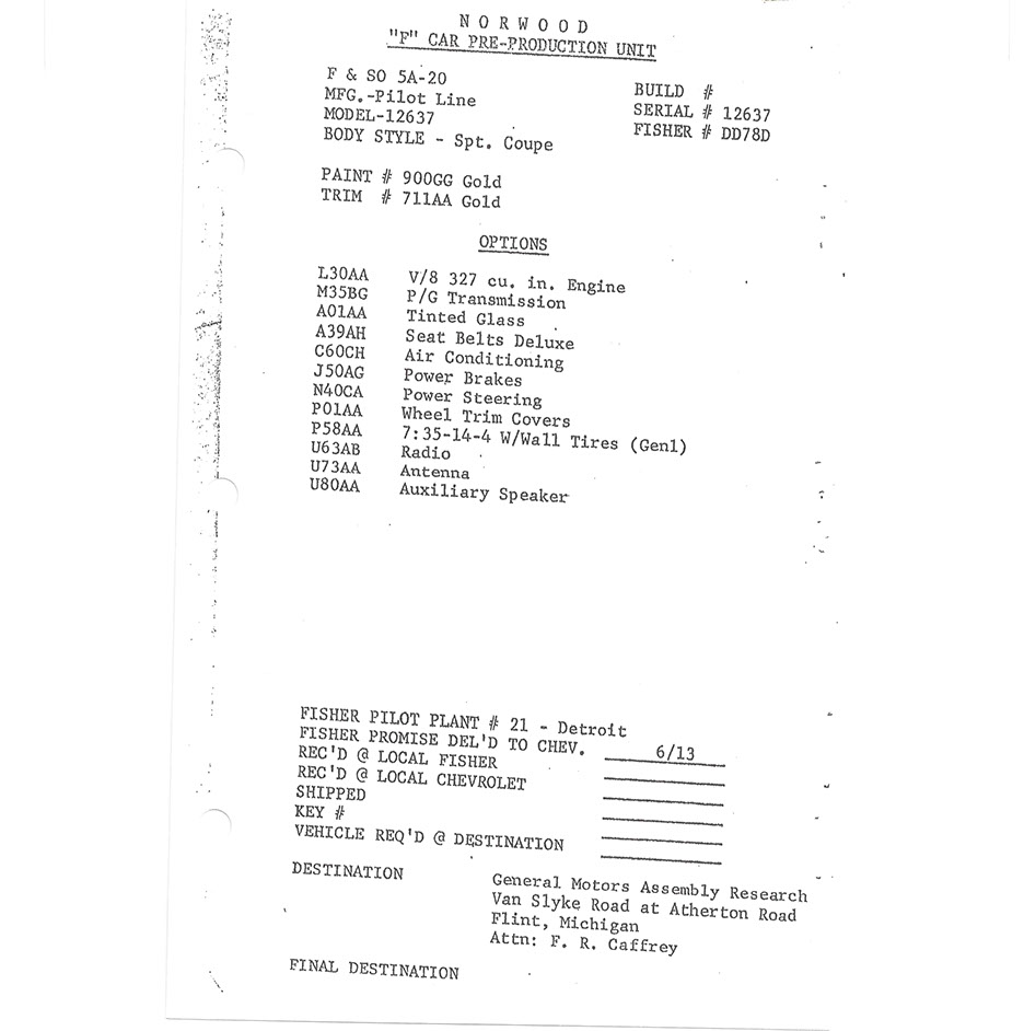 N100047, “The #2 Pilot Line Assembly Research Car”, was delivered on June 13, 1966 from Fisher Body as coach #DD78D. Like all F-Body Pilot Prototypes at Norwood, it started its hand built assembly in consecutive VIN number order as the forty-seventh build of the engineering study. One of four on Fleet and Special Order # 5A-20 made by Manufacturing-Pilot Line, it carried model # 12637. This gold on gold coupe was the thirty-fifth Camaro coupe ever built. With a 327 cubic-inch power plant and a power-glide automatic transmission, its lack of presence in General Motors photo shoots make this an elusive piece of early Camaro history. It was required to be received by F.R. Caffrey at General Motors Assembly Research at an unknown date. This build was ordered under the same fleet and special order # as the two plant manager cars. Our research and interviews show that these two builds were not used for research as their titles imply. Instead, they were used as promotional vehicles by the assembly research managers. Their late build sequence and lack of urgency at their destination substantiates our research. In fact, the majority of all research for this engineering study was conducted on site at Norwood. This differentiates these builds from other Pilot Prototype programs. NCRS certificates show #47 being returned to Corporate, Zone 0 and it thought to have been used as a company promotional vehicle shortly thereafter. Extensive and exhaustive history searches have gleaned no documented ownership history. Current whereabouts and existence is unknown as of 3-1-2015.